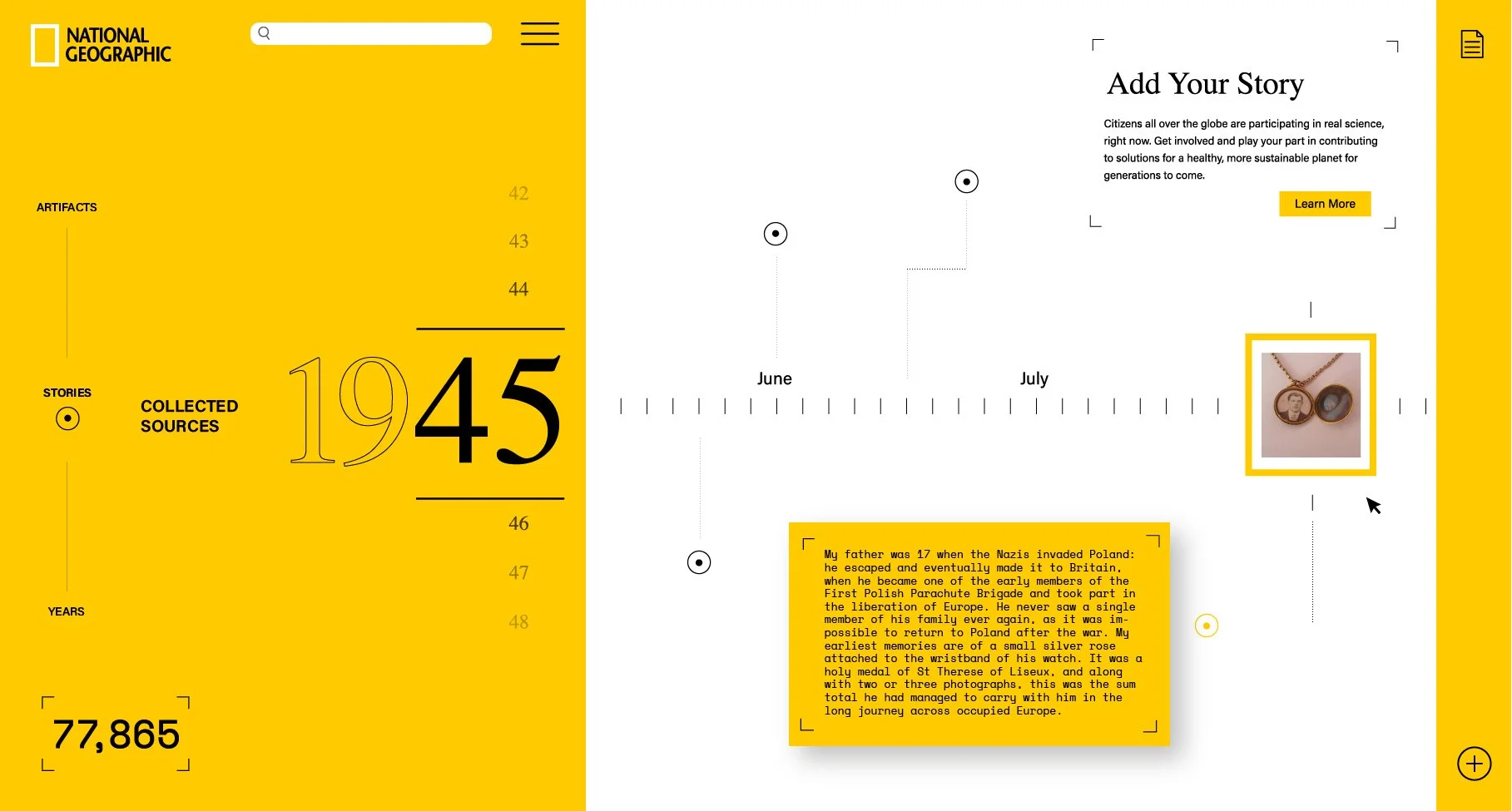 We focused on developing a prototype that could be traced back to National Geographic's mission and strategic aims. We propose to create a web-based platform that serves as an archive of primary sources to tell the human story. The platform will create a virtual space to allow users to share their oral history, family heirlooms, and stories. By sharing their personal artifacts and primary sources of personal history, users will have the ability to see how their personal history connects with that of others. These connections will allow users to understand how their personal story fits into a more comprehensive, broad view of history.
